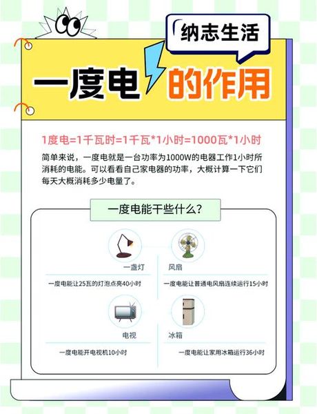 1度电等于1000瓦的电器工作1小时所消耗的电能,这个概念在日常生活中非常重要,有助于我们更好地管理和节约用电。
